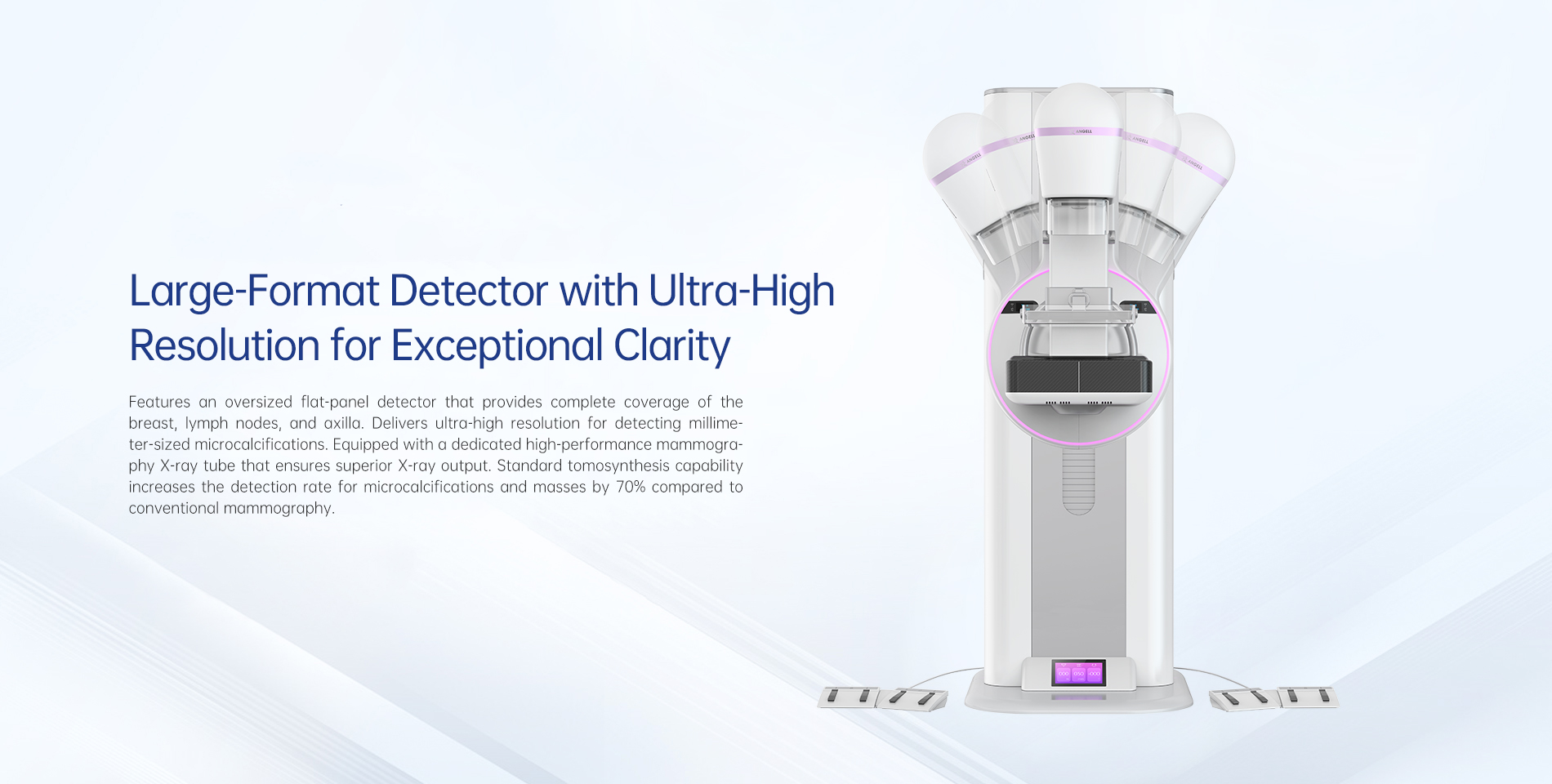 Cuenta con un detector de panel plano de gran tamaño que proporciona cobertura completa de la mama, ganglios linfáticos y axila. Ofrece una resolución ultra alta para detectar microcalcificaciones milimétricas. Equipado con un tubo de rayos X mamográfico de alto rendimiento que garantiza una salida de rayos X superior. La capacidad estándar de tomosíntesis aumenta la tasa de detección de microcalcificaciones y masas en un 70% en comparación con la mamografía convencional.