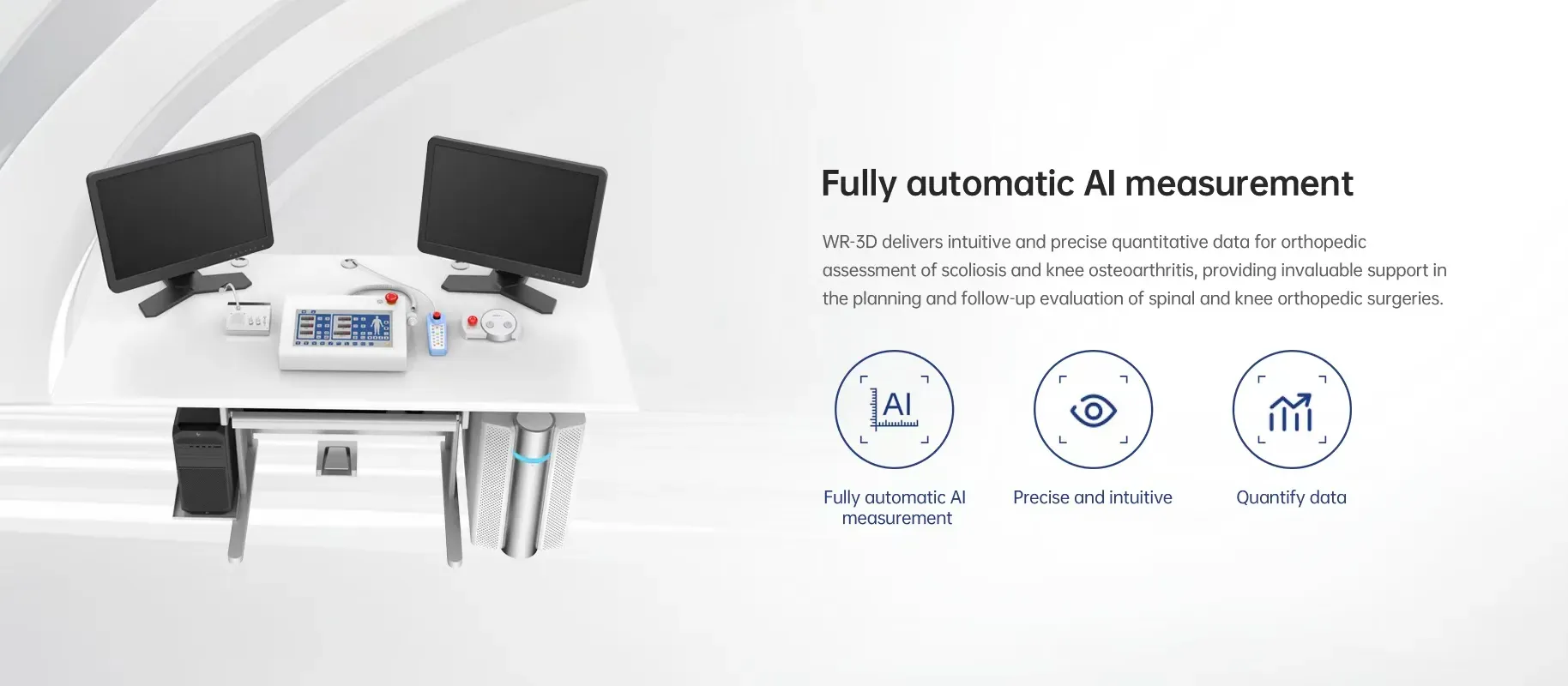 WR-3D proporciona datos cuantitativos intuitivos y precisos para la evaluación ortopédica de escoliosis y osteoartritis de rodilla, ofreciendo un apoyo invaluable en la planificación y evaluación de seguimiento de cirugías ortopédicas espinales y de rodilla.