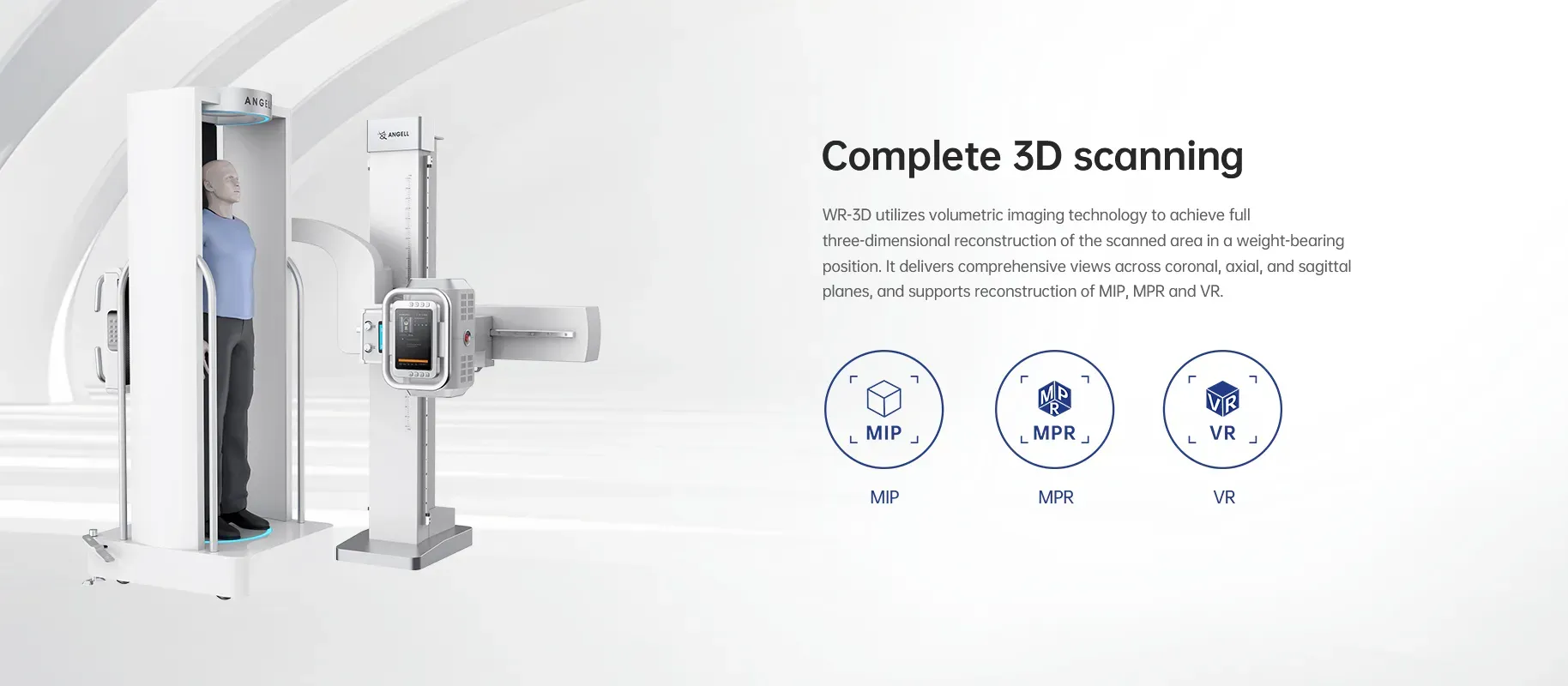 WR-3D utiliza tecnología de imagen volumétrica para lograr la reconstrucción tridimensional completa del área escaneada en posición de carga de peso. Ofrece visualizaciones integrales en los planos coronal, axial y sagital, y admite la reconstrucción MIP, MPR y VR.