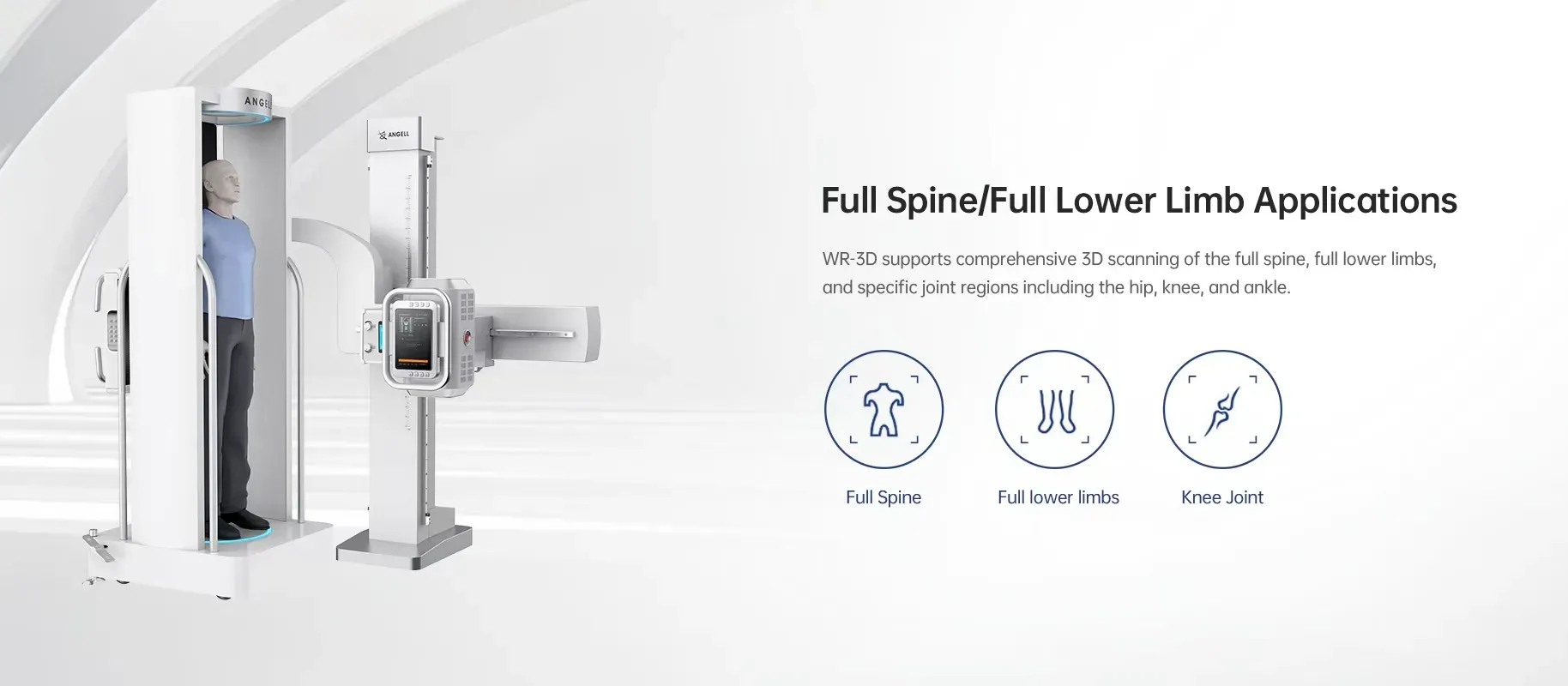 WR-3D permite el escaneo 3D integral de la columna vertebral completa, extremidades inferiores completas y regiones articulares específicas como cadera, rodilla y tobillo.