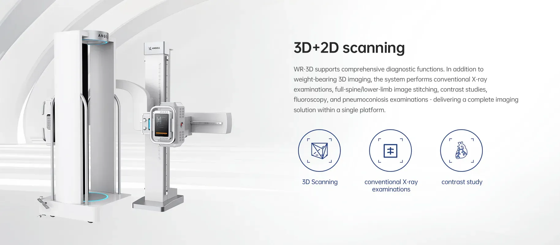 WR-3D integra funciones diagnósticas completas. Además de la imagen 3D con carga de peso, el sistema realiza exámenes de rayos X convencionales, empalme de imágenes de columna completa/extremidades inferiores, estudios de contraste, fluoroscopia y exámenes de neumoconiosis, ofreciendo una solución de imagen integral en una única plataforma.